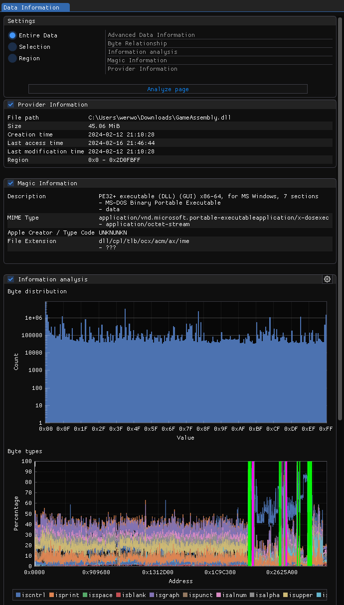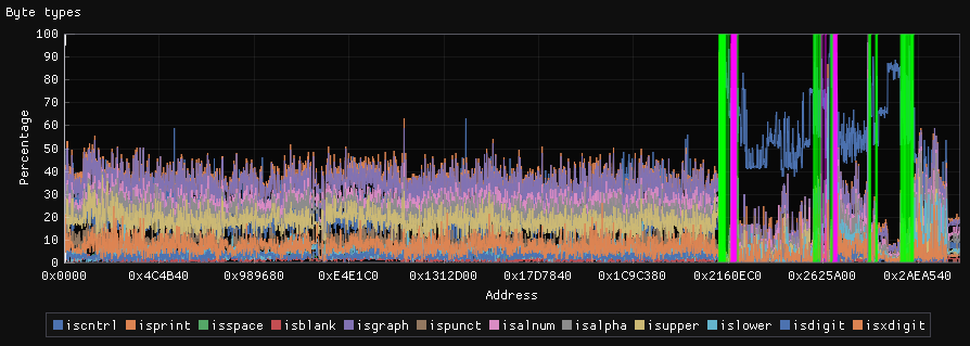 The byte type is determined using the [`<cctype>`](https://en.cppreference.com/w/c/string/byte) functions listed in the legend below. To hide certain types, simply click on their legend entry. There's also a drag bar on the graph that can be moved around to jump to the offset of that block in the Hex Editor View.