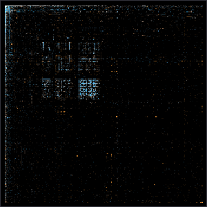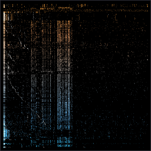 The Digram visualizer takes random pairs of two bytes from the data and calculates their relative frequency. The value of the first byte is then used as the Y-Value, the value of the second byte as the X-Value starting from the top left. Pairs of bytes that are less abundant are then displayed in a faint Orange while pairs that appear more frequently are displayed in Blue or White.