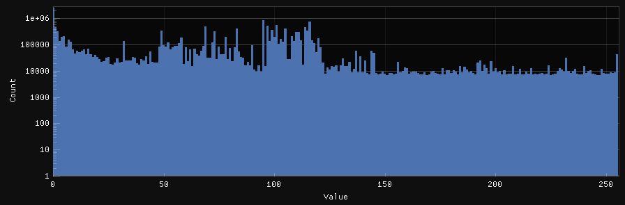 The Byte distribution graph is a Histogram which displays the number of occurrences of each byte using a logarithmic scale. In the graph above you can see that most bytes are equally likely to occurr but bytes close to `0x00` and around `100` (the ASCII range) are more abundant.