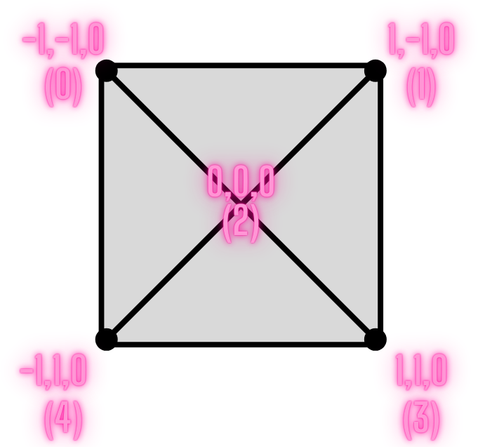 * Vertices array containing 5 elements can also represent 4 triangles by using a 12-element `indices` array - every group of 3 elements in that array representing a triangle, so indices array elements with indices 0,1,2 is the first triangle, indices 3,4,5 are the second triangle and so on.